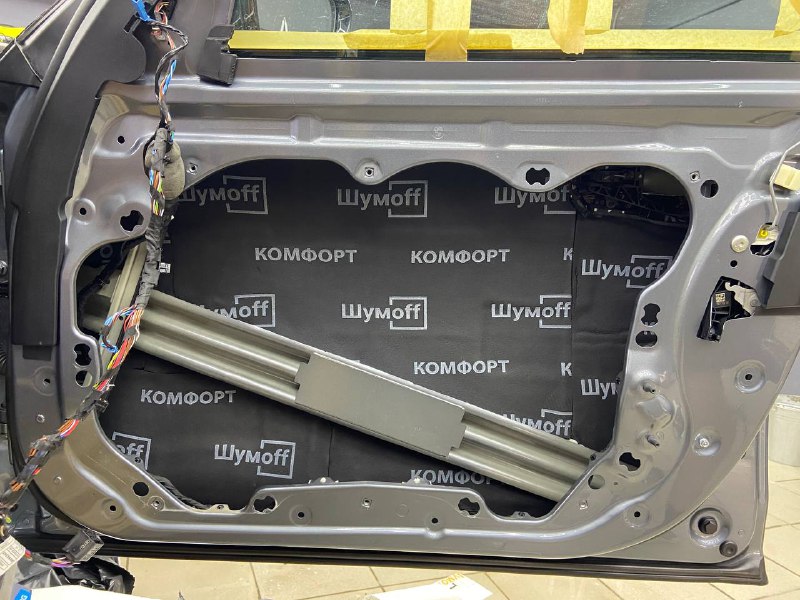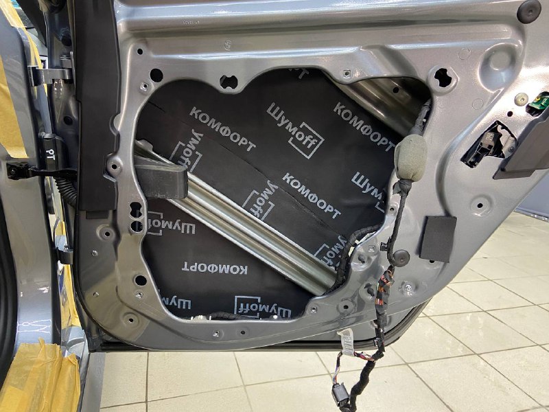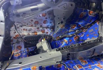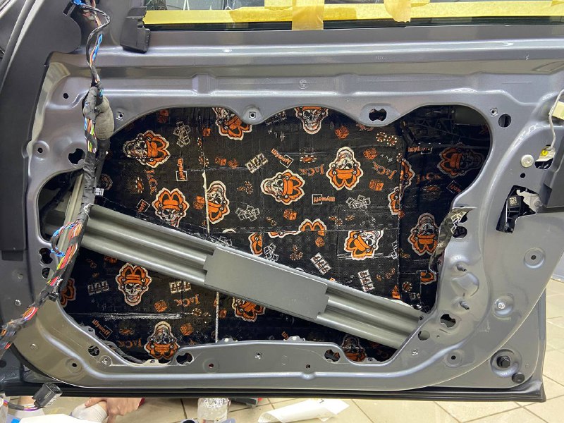Третьим слоем применяем виброизоляцию Шумофф Jack на внутреннюю стенку двери. Проводку частично обрабатываем Шумофф Specific. Саму обшивку двери оклеиваем виброизоляцией Шумофф Jack и полностью закрываем шумопоглощающим материалом Шумофф Герметон А15. Обратите внимание, как тщательно мы обрабатываем двери виброизоляцией и шумопоглотителем - мы не экономим материал и щедро укладываем его в необходимые места. По канту обшивки двери и клипсы укладываем Шумофф Absorber 5, чтобы избежать раздражительных звуков и не портить ЛКП.