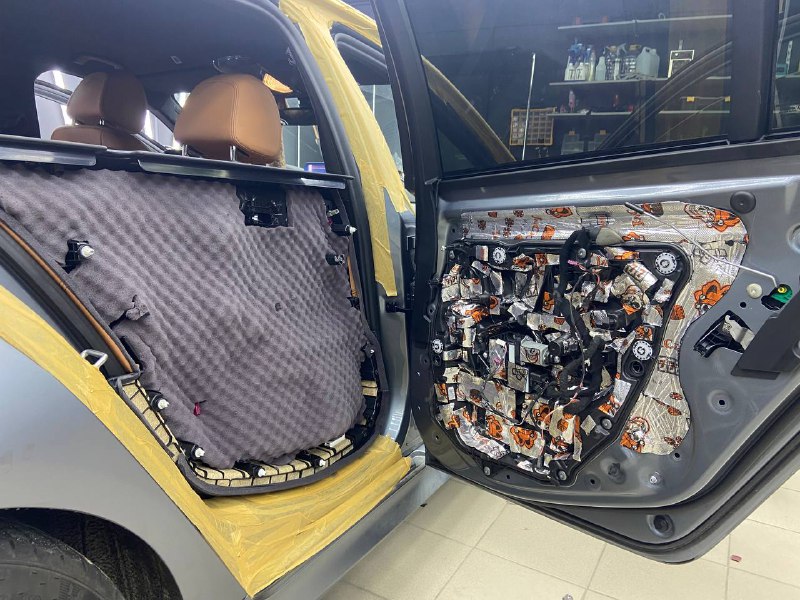 Начинаем работу с разборки дверей, подготовки поверхности и обезжириванию. Все работы по демонтажу пластика выполняются специальным инструментом. Мы гарантируем целостность клипс, креплений и отсутствие различного рода царапин, задиров на обшивках.