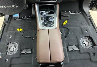 На фото ниже вы можете увидеть дополнительную шумоизоляцию на дверях, которая выполнена в 5 слоёв по нашей авторской технологии. 2 слоя нанесены на внешнюю стенку двери, один на внутреннюю и 2 слоя на дверных картах. В продаже есть готовые комплекты для дверей, а способ установки описан в подробном отчете по комплексной шумоизоляции БМВ Х6.