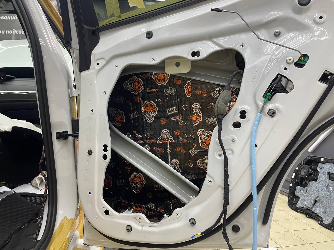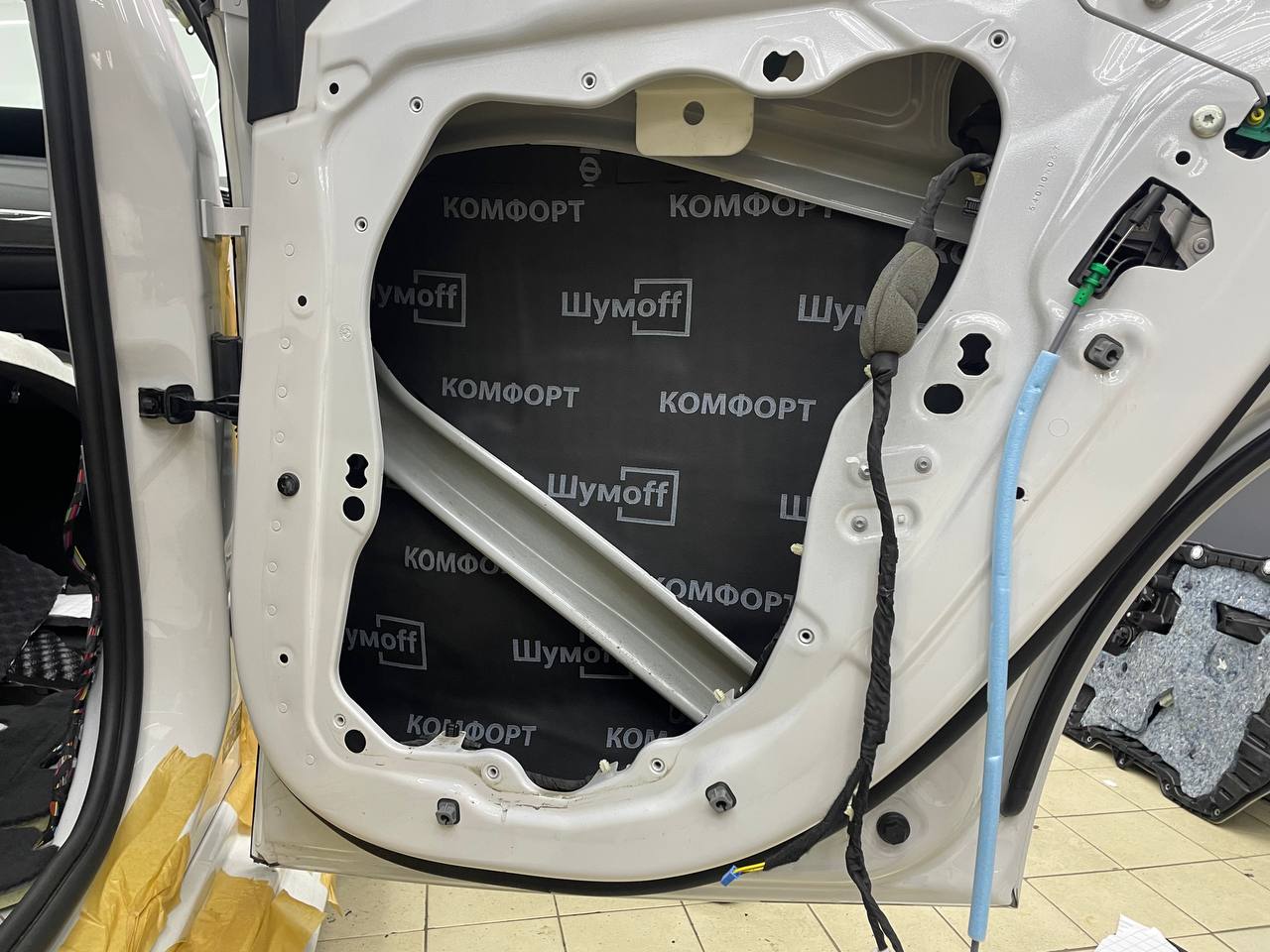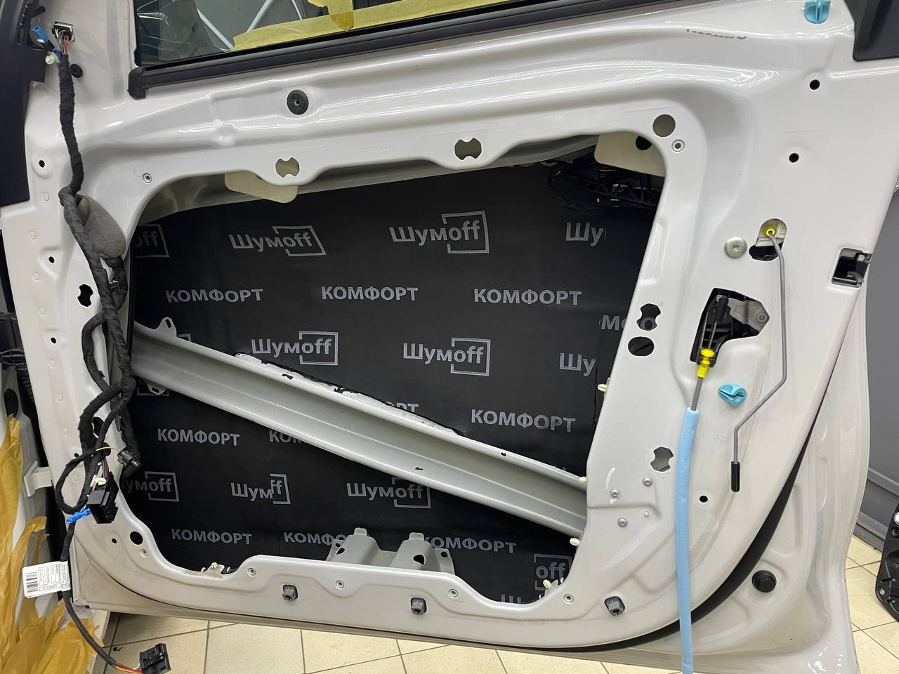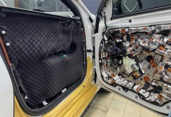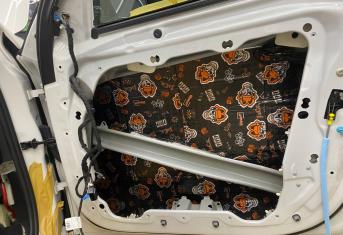Третьим слоем применяем виброизоляцию Шумофф Jack на внутреннюю стенку двери. Проводку частично обрабатываем Шумофф Specific. Саму обшивку двери оклеиваем виброизоляцией Шумофф М2 и полностью закрываем шумопоглощающим материалом Шумофф Герметон А15. Обратите внимание, как тщательно мы обрабатываем двери виброизоляцией и шумопоглотителем - мы не экономим материал и щедро укладываем его в необходимые места. По канту обшивки двери и клипсы укладываем Шумофф Absorber 5, чтобы избежать раздражительных звуков и не портить ЛКП.