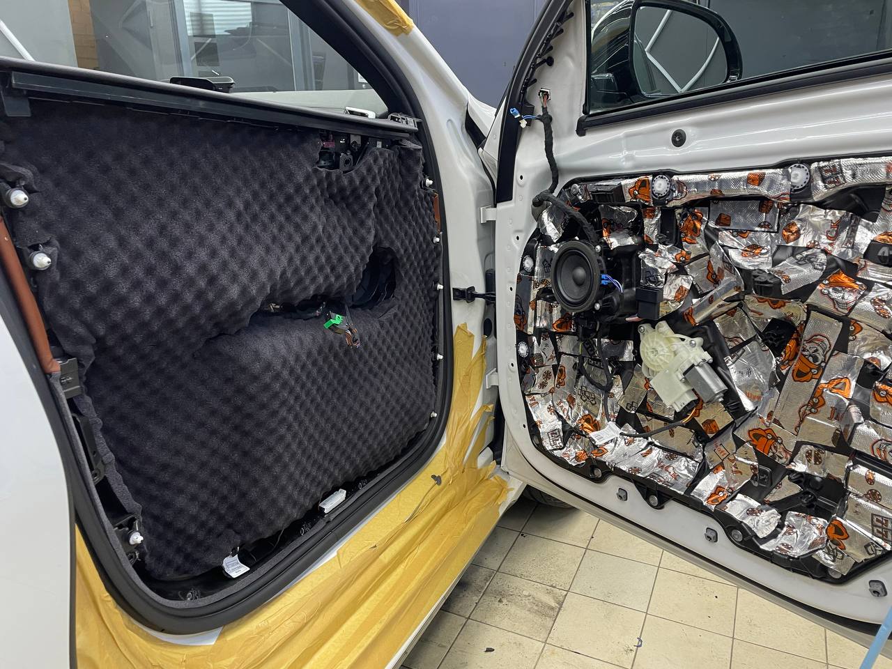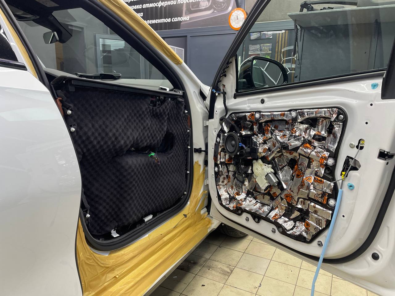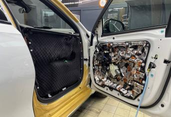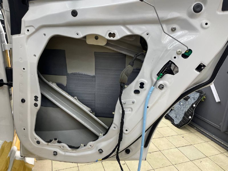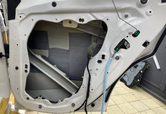 Начинаем работу с разборки дверей, подготовки поверхности и обезжириванию. Все работы по демонтажу пластика выполняются специальным инструментом. Мы гарантируем целостность клипс, креплений и отсутствие различного рода царапин, задиров на обшивках.