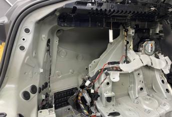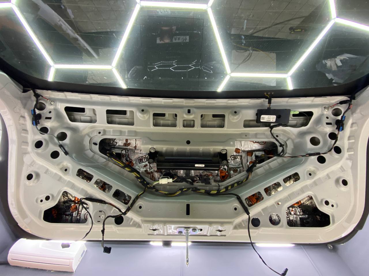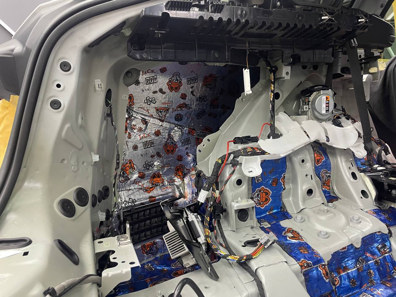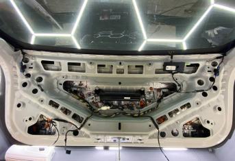 На внешний металл крышки багажника наносим виброизоляцию ШумоФФ Jack. На обшивку монтируем ШумоФФ Jack и шумопоглотитель Absorber A15. По канту обшивки и клипсы обрабатываем Шумофф Absorber 5. Проводку обрабатываем Шумофф Specific.