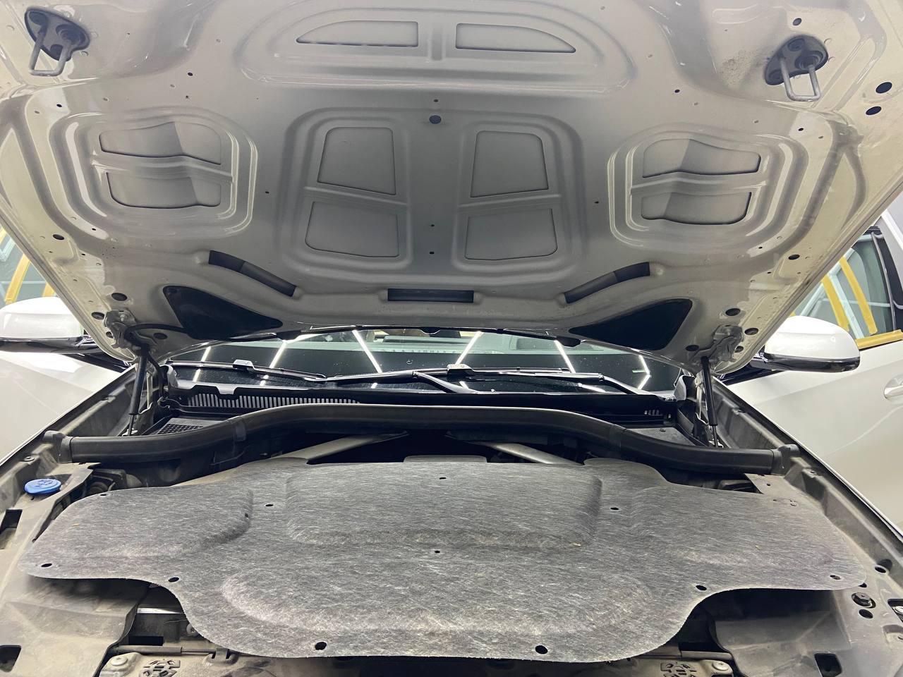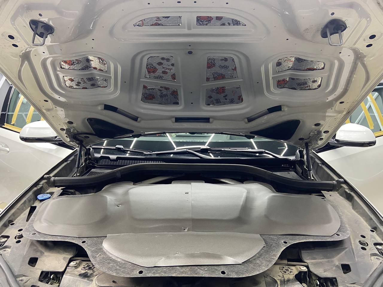 На внешний металл крышки капота наносим виброизоляцию ШумоФФ Jack, на штатную обивку капота монтируем шумотеплоизолятор Шумофф П4. Капот мы клеем бесплатно при заказе комплексной шумоизоляции автомобиля!