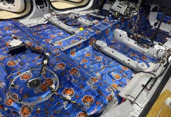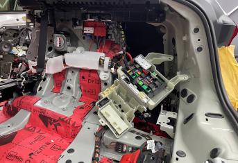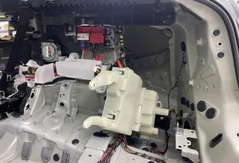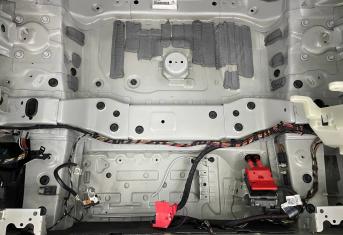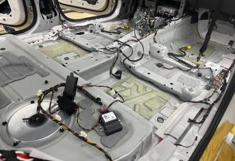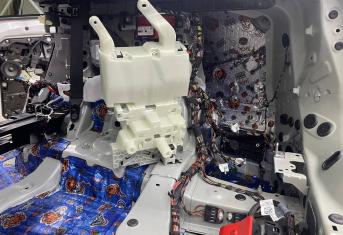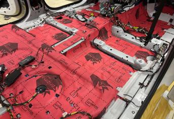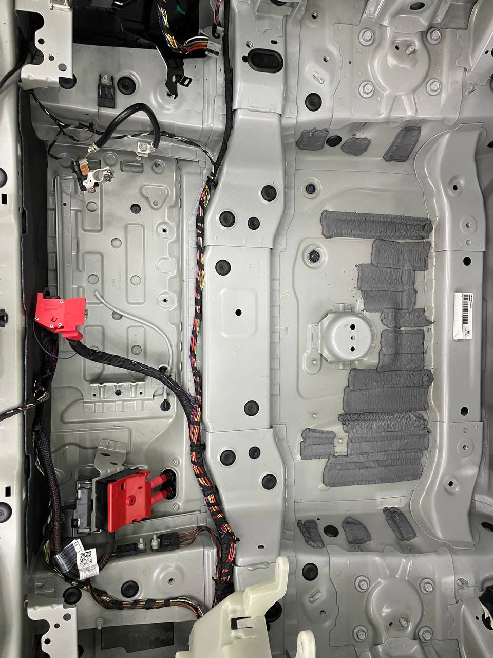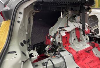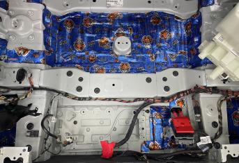 Штатная шумоизоляция в BMW X6 уложена выборочно. Напыления вибродемпфера есть на полу салона и багажника, дверях. Ниже вы можете увидеть фотографии после полного разбора. Перед началом работ, мы в обязательном порядке проверяем заводскую шумоизоляцию на качество укладки. Плохо проклеенные участки демонтируем. После обезжириваем все поверхности и приступаем к монтажу.