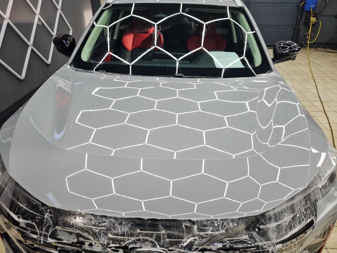 В работе применяем полиуретановую пленку NAR, толщиной 190 микрон. Эта пленка обладает функцией самовосстановления небольших царапин при высокой температуре. Клиент выбрал для своего автомобиля пакет Трасса, что подразумевает оклейку передней части кузова и оптики.