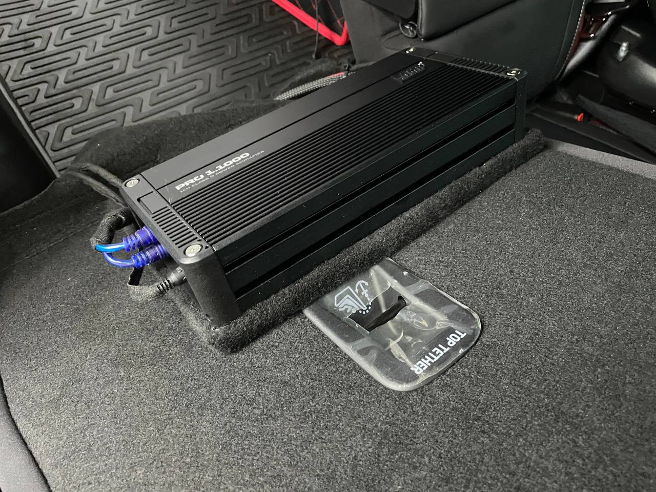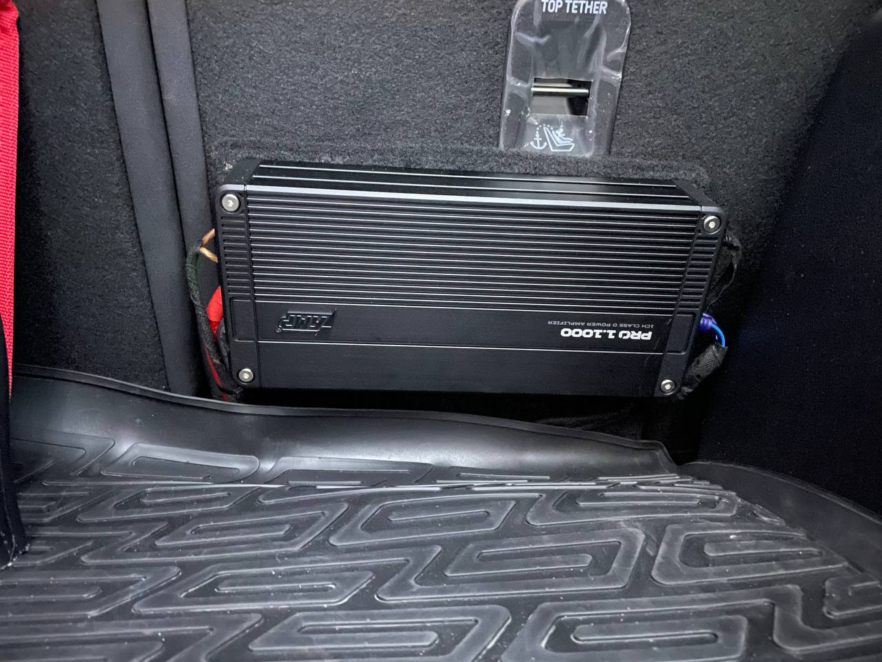 Усилитель смонтировали на спинке заднего ряда сидений. Силовая проводка уложена по штатным местам, с обязательной установкой предохранителя под капотом. Тем самым мы сохранили функционал автомобиля и выиграли немного места в багажнике. Смотрите фото выполненных работ ниже.