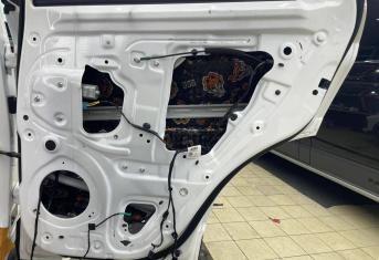 Начинаем работу с разборки дверей, подготовки поверхности и обезжириванию. Все работы по демонтажу пластика выполняются специальным инструментом. Мы гарантируем целостность клипс, креплений и отсутствие различного рода царапин, задиров на обшивках.