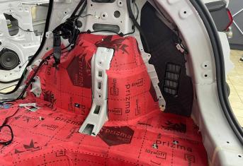 Второй слой – Шумофф Prizma шумоизолятор на основе вспененного каучука со звукоотражающей мембраной, это современный и технологичный материал который включает в себя сразу два слоя! Его мы применяем на всю плоскость пола салона и багажника в том числе и задние арки в багажнике. В задние крылья вторым слоем монтируем шумопоглотитель Шумофф Absorber А15, максимально закрывая всю плоскость крыла на сколько это позволяет конструкция автомобиля.