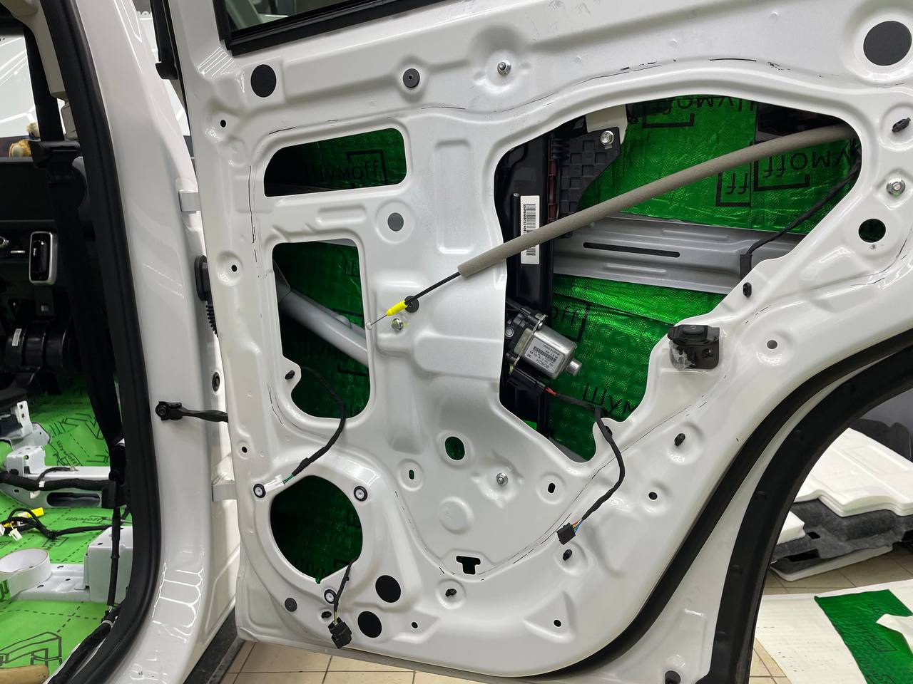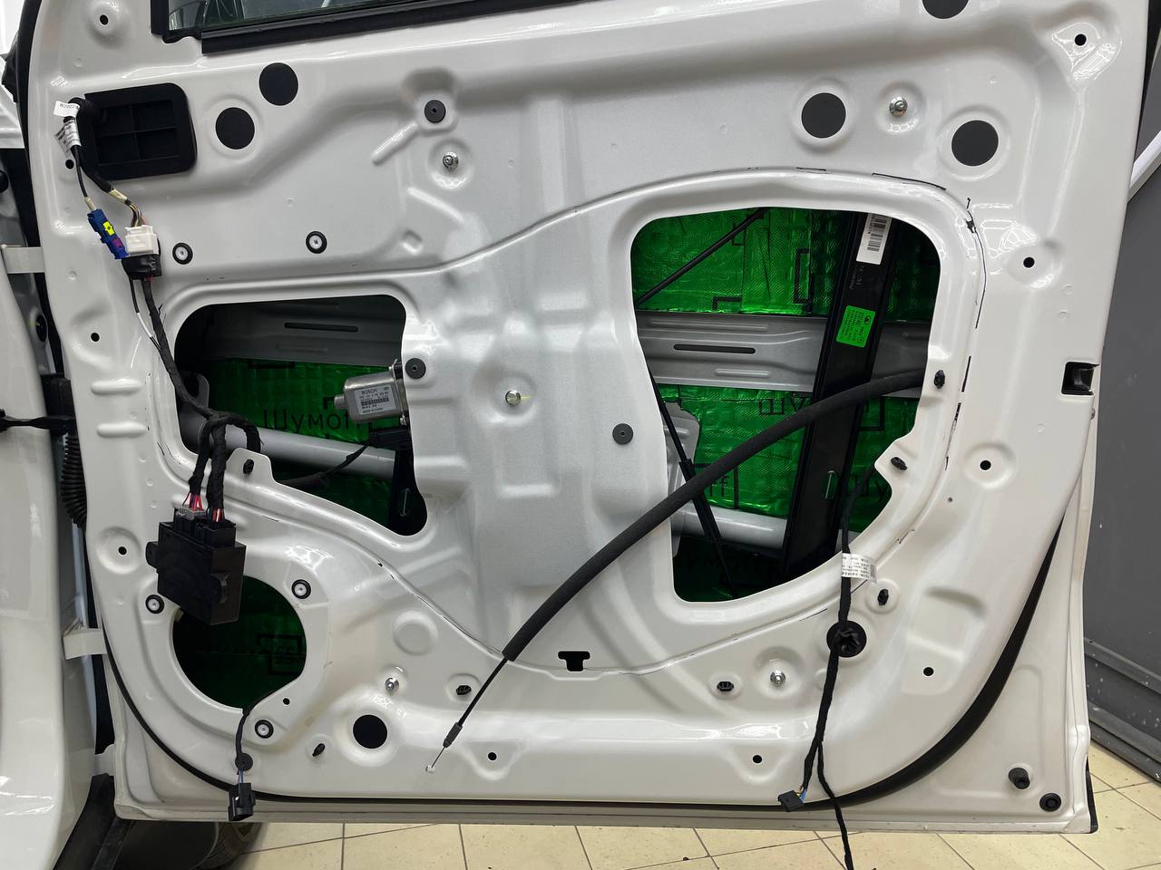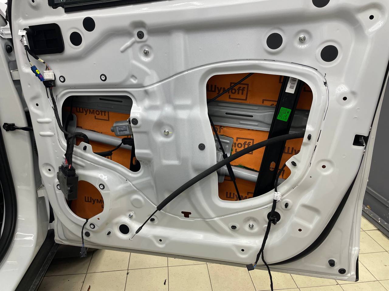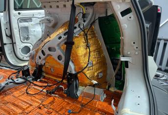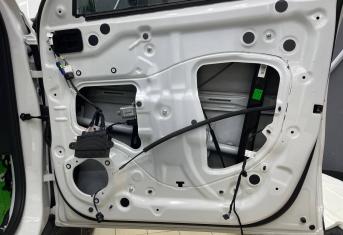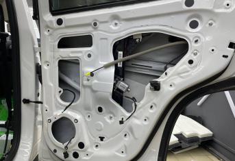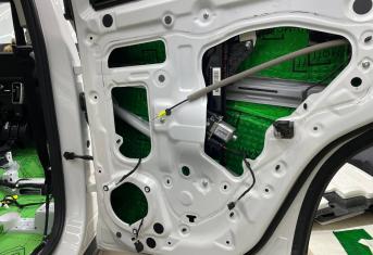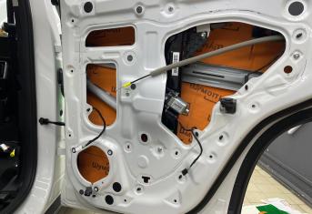 Вторую стенку двери обрабатываем Шумофф М2. Саму обшивку двери локально оклеиваем виброизоляцией Шумофф М2 для снижения резонанса пластика и полностью закрываем новым шумопоглощающим материалом Шумофф Ultimat W17. По канту обшивки двери и клипсы обрабатываем Шумофф Absorber 5, а на открытую проводку Шумофф Specific.