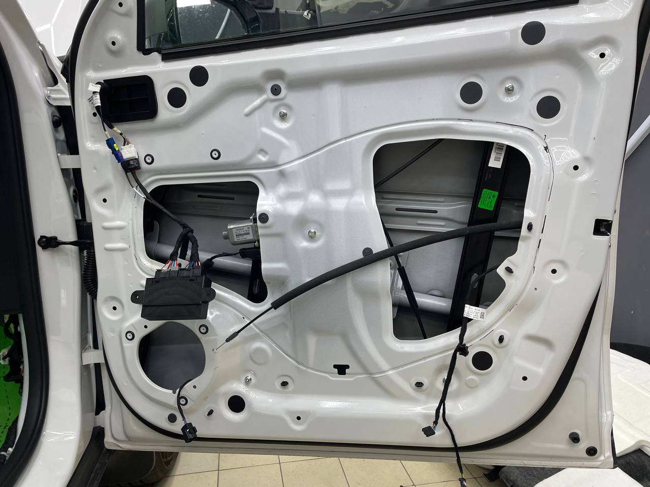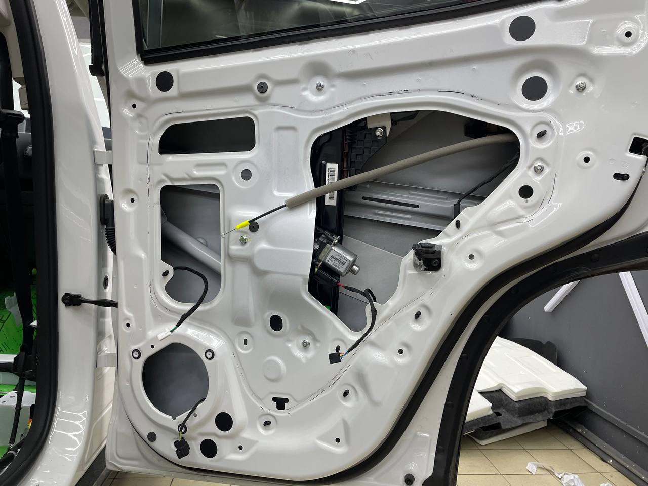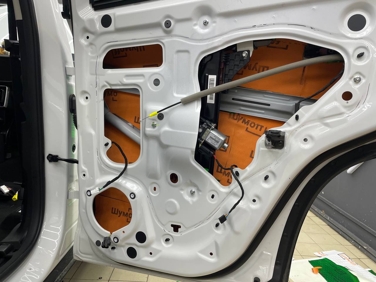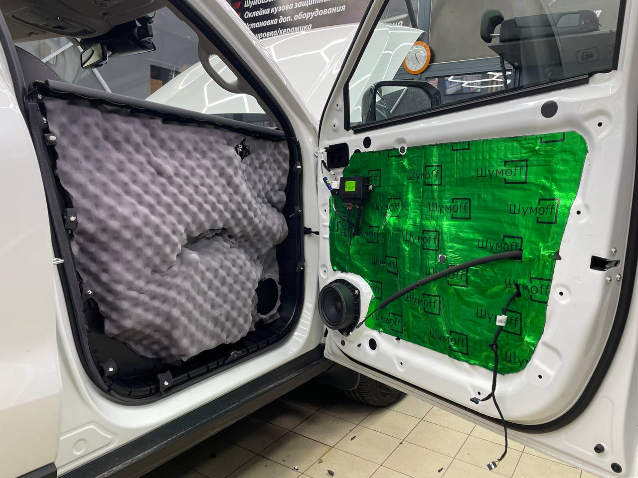 Вторую стенку двери обрабатываем Шумофф М2. Саму обшивку двери локально оклеиваем виброизоляцией Шумофф М2 для снижения резонанса пластика и полностью закрываем новым шумопоглощающим материалом Шумофф Ultimat W17. По канту обшивки двери и клипсы обрабатываем Шумофф Absorber 5, а на открытую проводку Шумофф Specific.