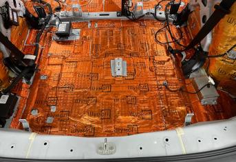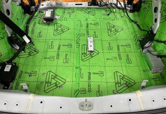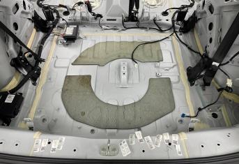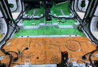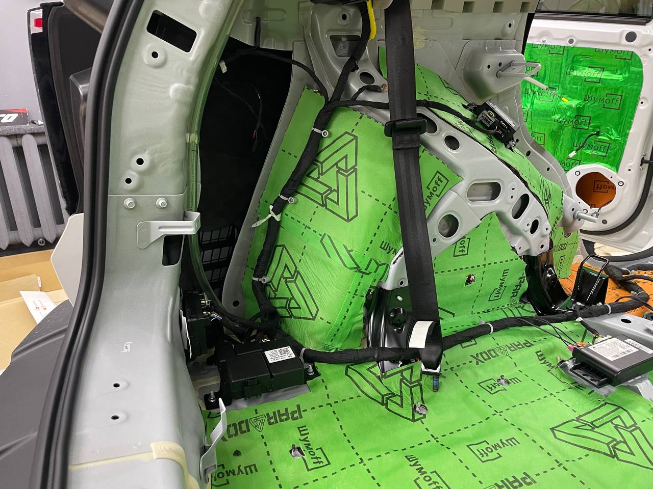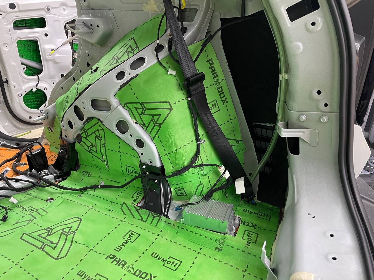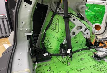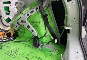 Вторым слоем для шумоизоляции пола мы используем Шумофф Парадокс для всей нижней части салона за исключением места под задним сидением, туда монтируем Шумофф Композит, чтобы избежать проблем со установкой заднего сидения. Это новые материалы от производителя Шумофф, которые включают в себя сразу два слоя и кратно повышают результативность. На задние крылья наносим шумопоглотитель Practick Flex A15.