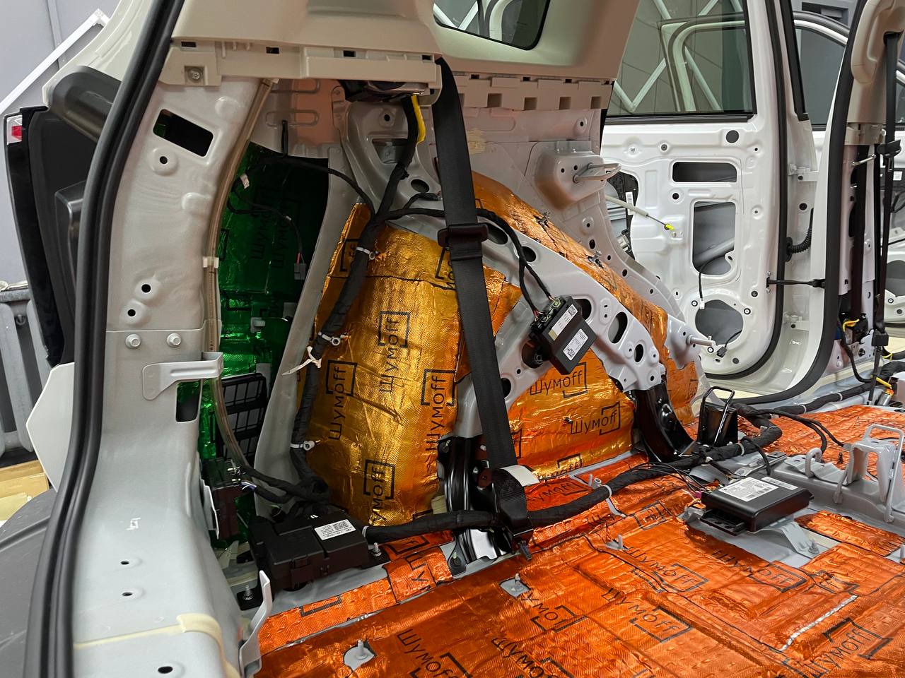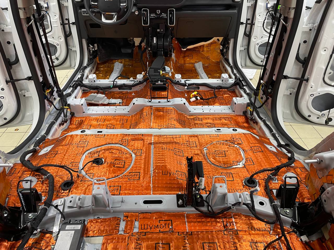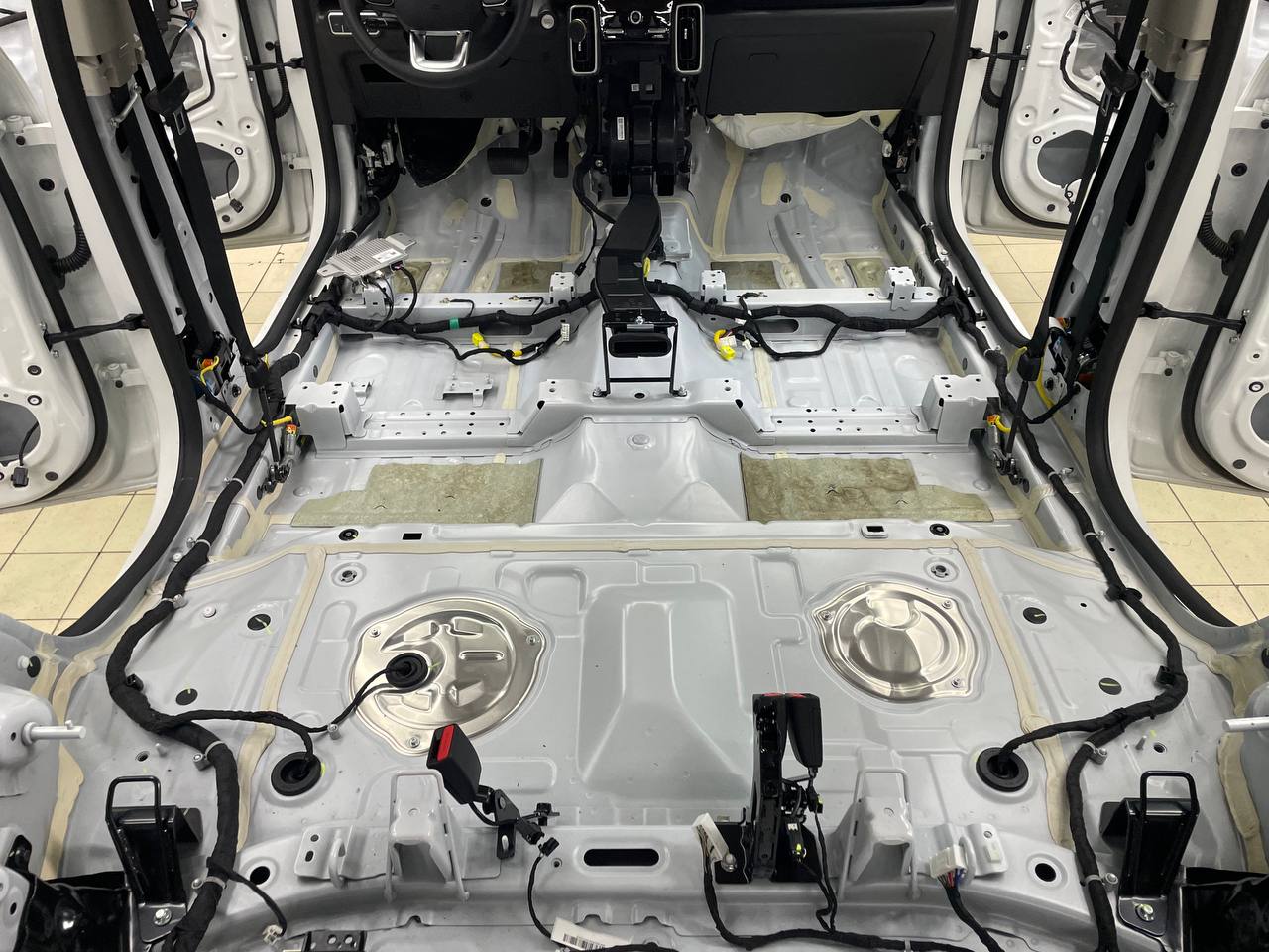 Штатная шумоизоляция в Haval Dargo уложена выборочно. Виброизоляция есть на полу салона и багажника. Держится она достаточно крепко и новые материалы мы наносили поверх штатного напыления. Двери и арки голый металл. Ниже вы можете увидеть фотографии после полного разбора.