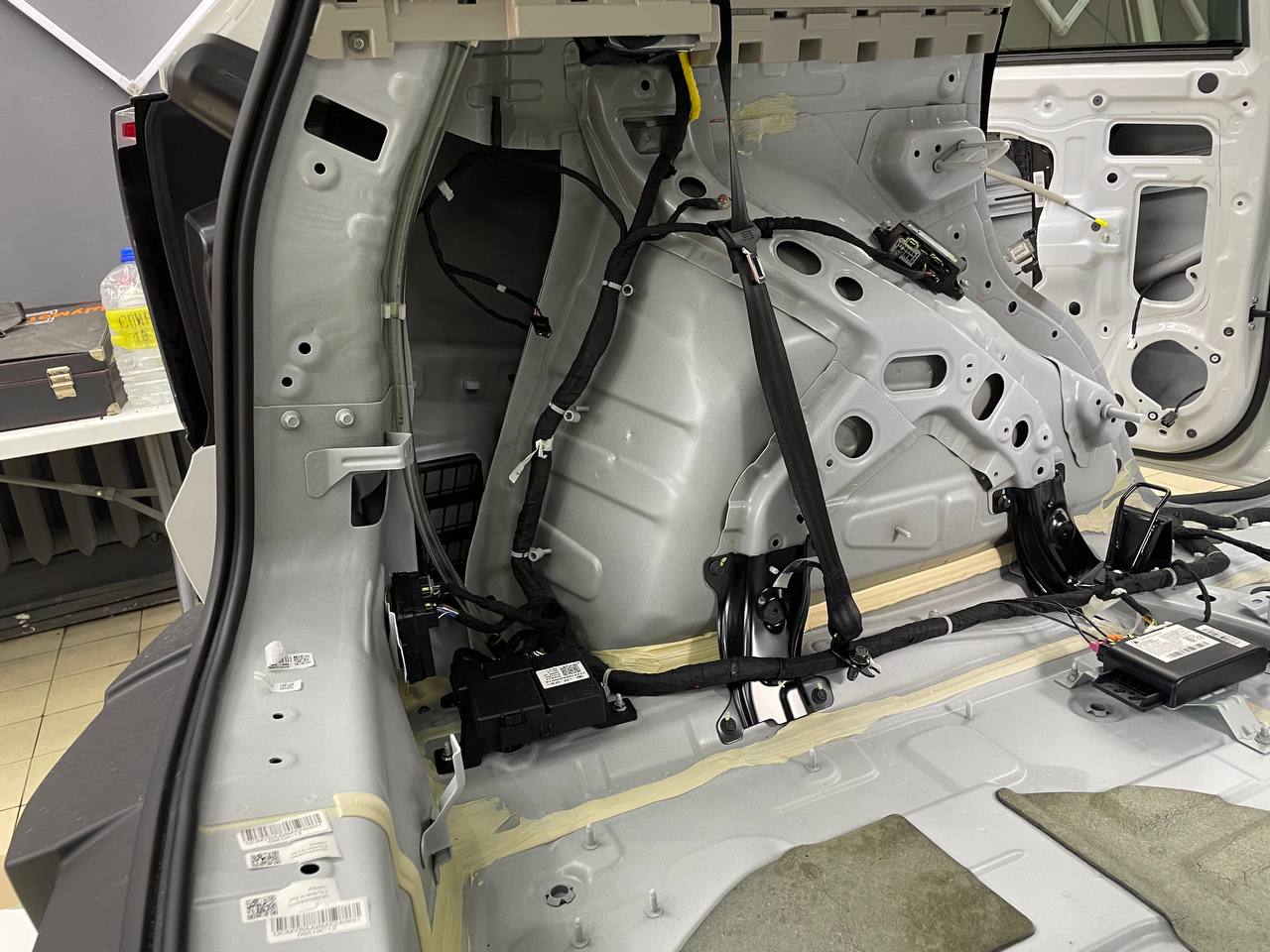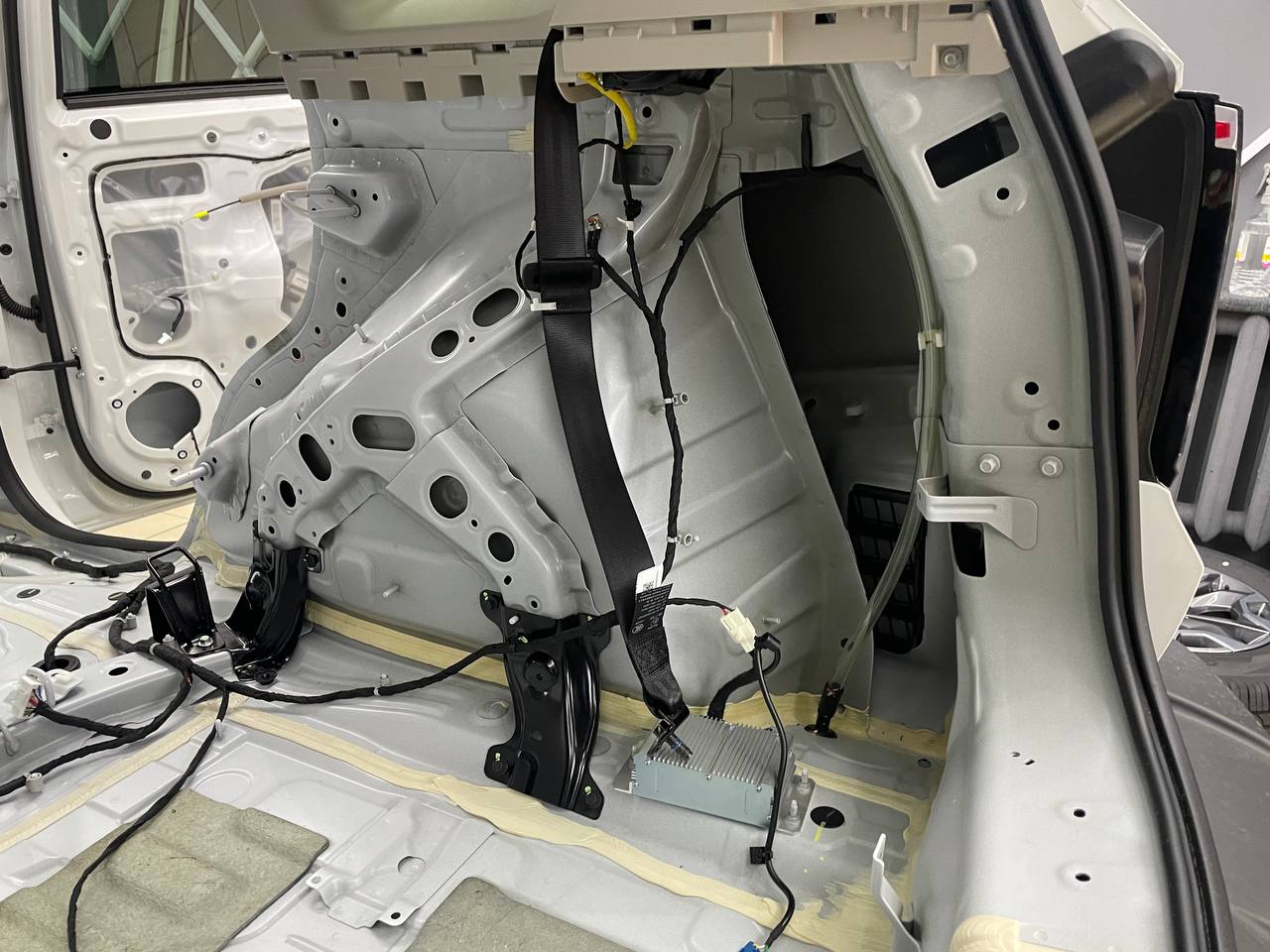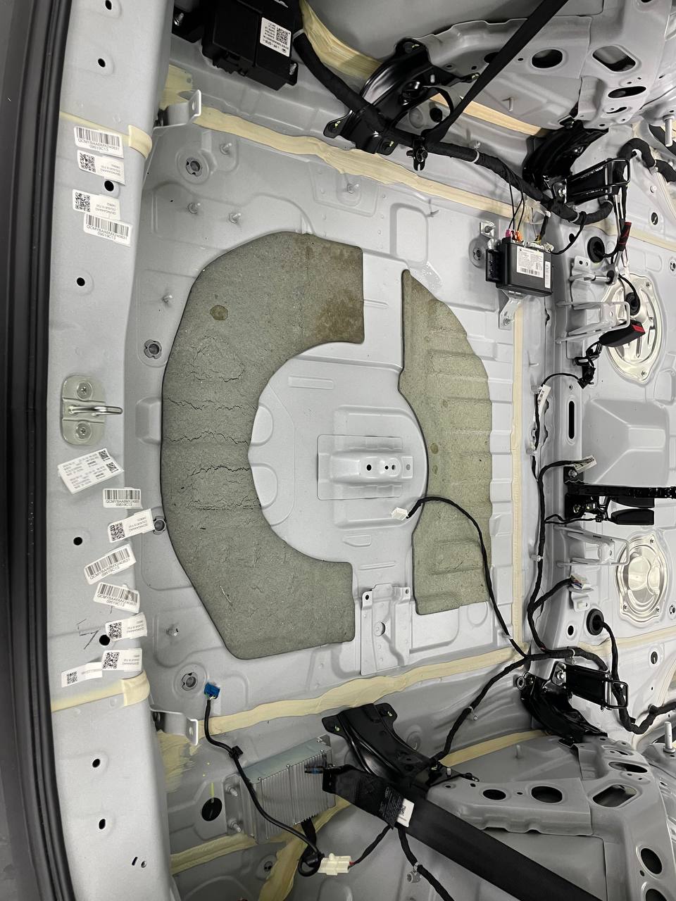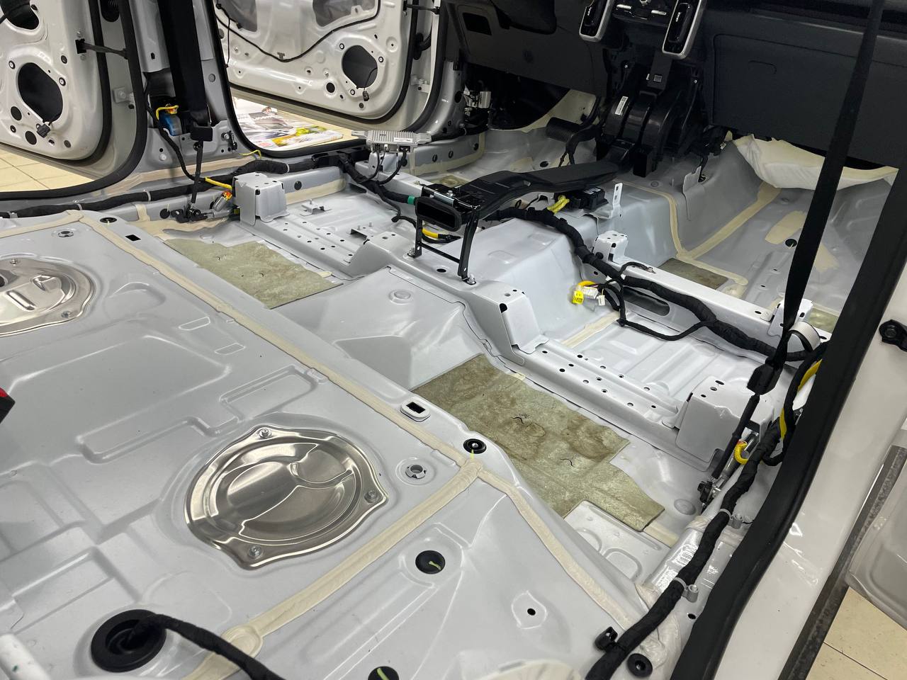 Штатная шумоизоляция в Haval Dargo уложена выборочно. Виброизоляция есть на полу салона и багажника. Держится она достаточно крепко и новые материалы мы наносили поверх штатного напыления. Двери и арки голый металл. Ниже вы можете увидеть фотографии после полного разбора.