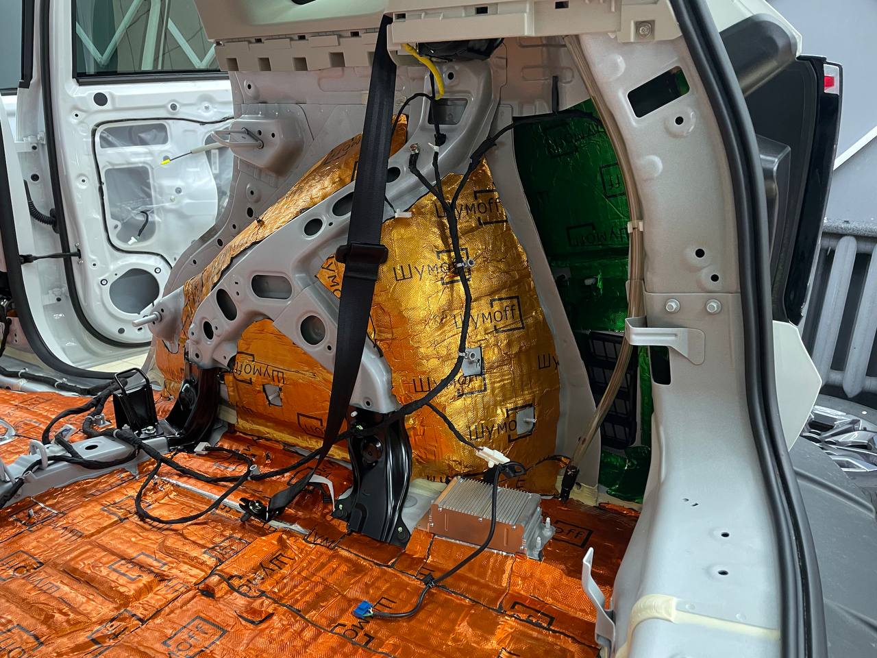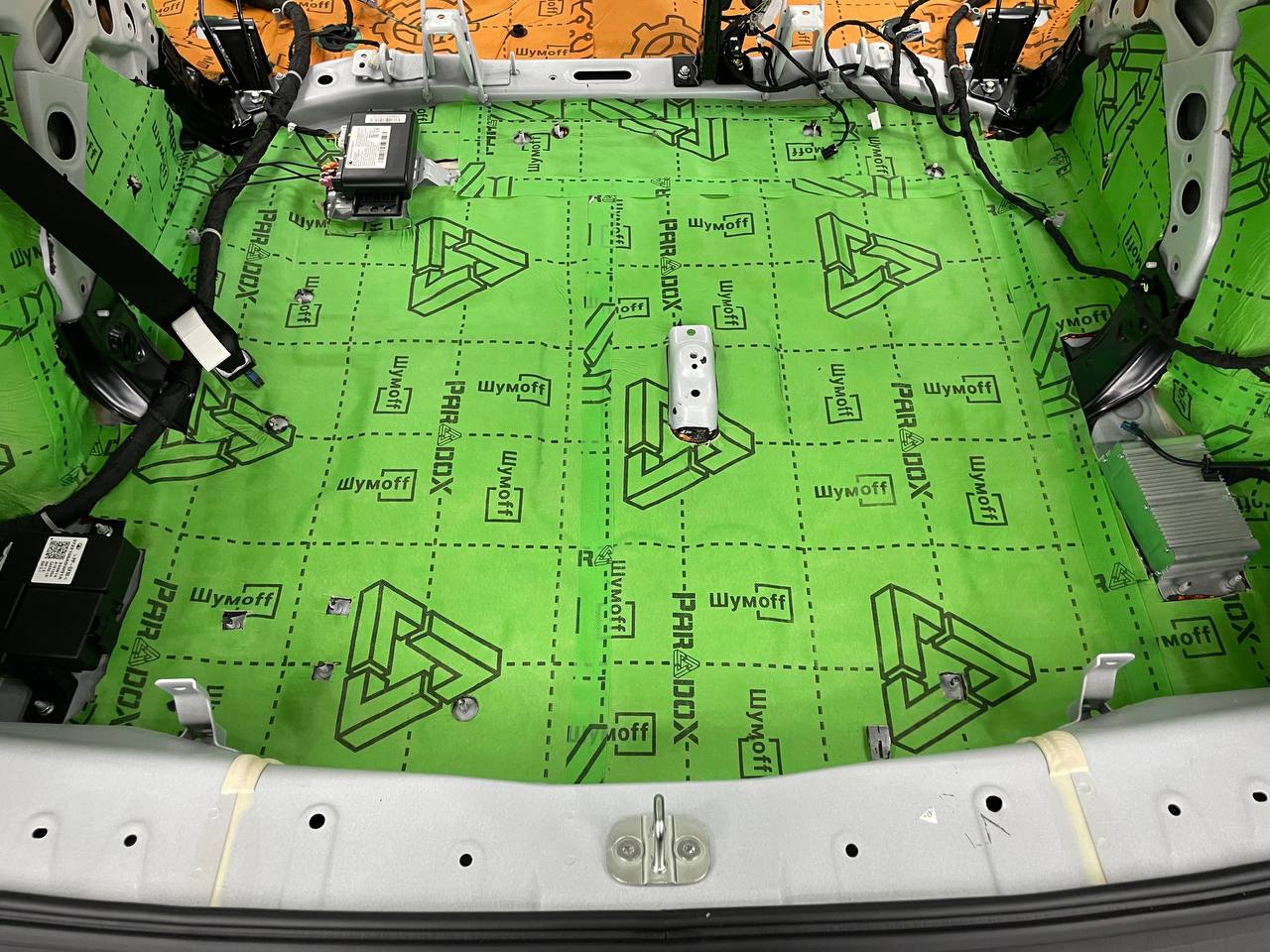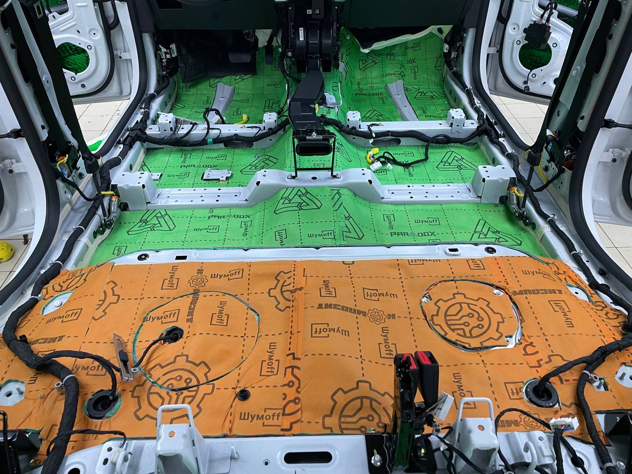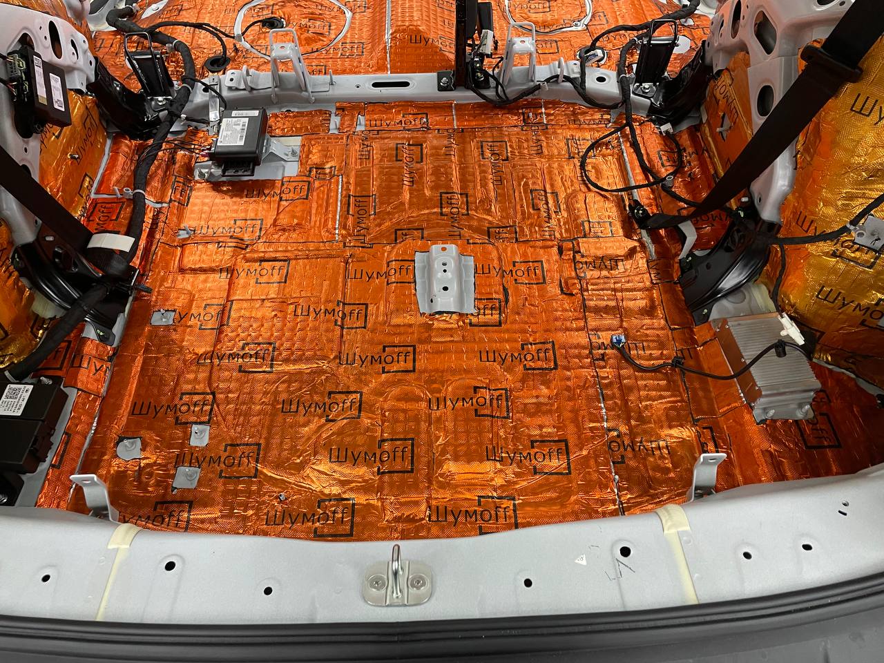 Первым слоем укладывается виброизоляция Шумофф М4, М3 и М2. Шумофф М4 пойдет на переднюю часть пола и задние арки, М2 на задние крылья в багажнике. Остальную поверхность обрабатываем Шумофф М3. Поверх усилителей она не наносится, чтобы избежать парникового эффекта и появлению влаги под ковром.