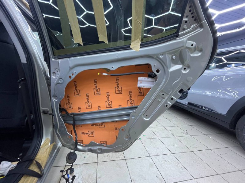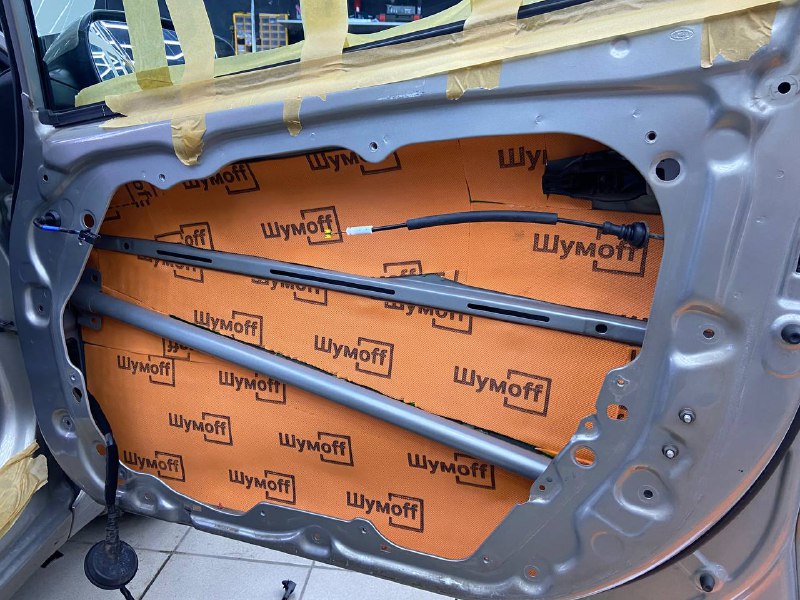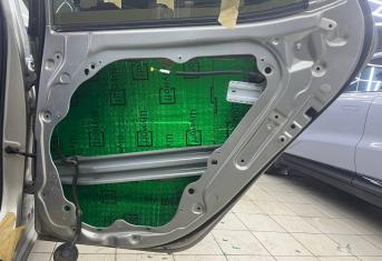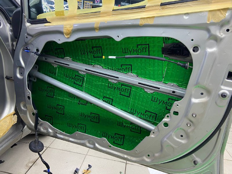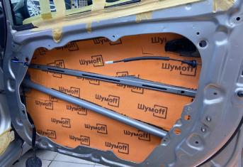 Вторую стенку двери обрабатываем Шумофф М2. Саму обшивку двери локально оклеиваем виброизоляцией Шумофф М2 для снижения резонанса пластика и полностью закрываем новым шумопоглощающим материалом от компании Шумофф, это Ultimat W17. По канту обшивки двери укладываем Шумофф Absorber 5, а на открытую проводку Шумофф Specific.