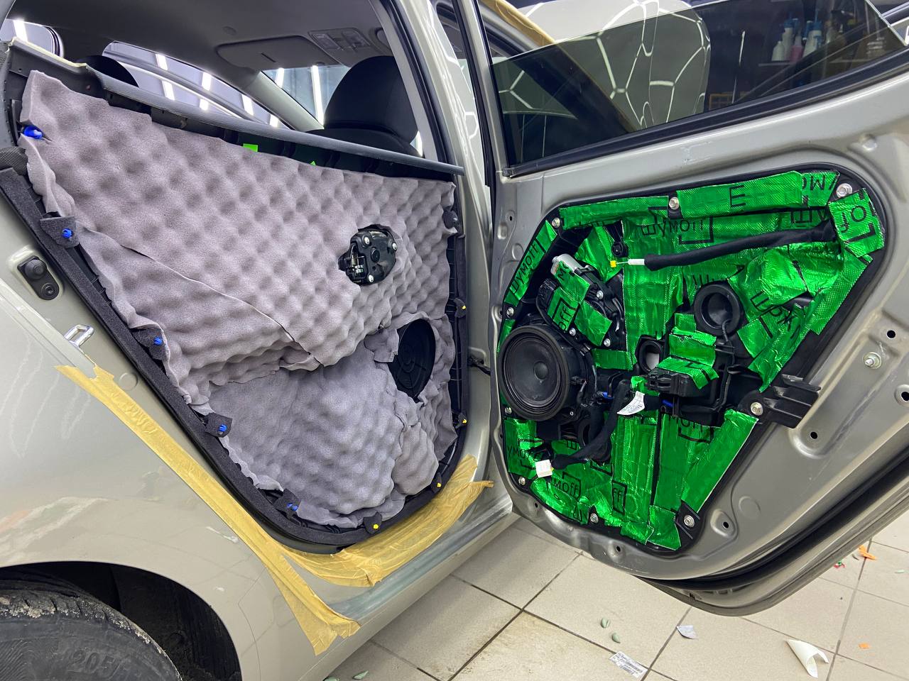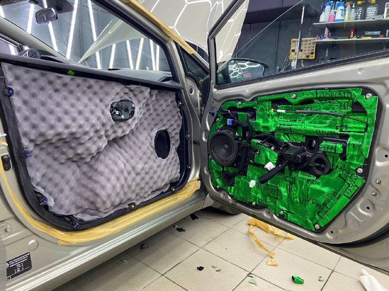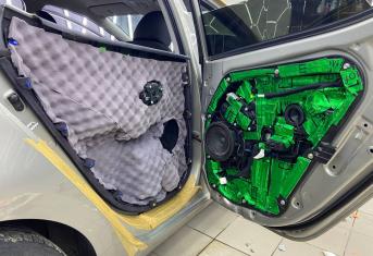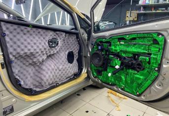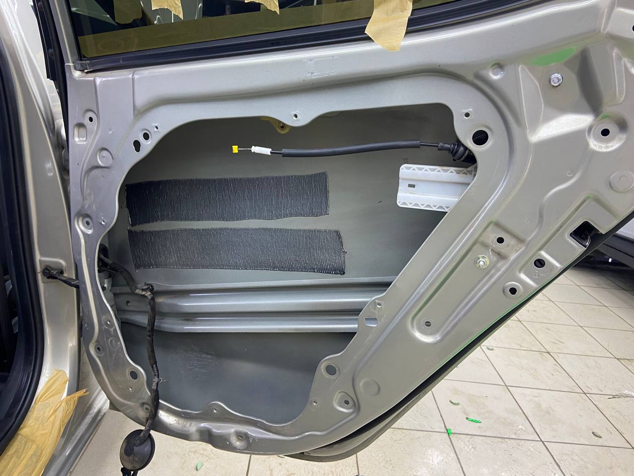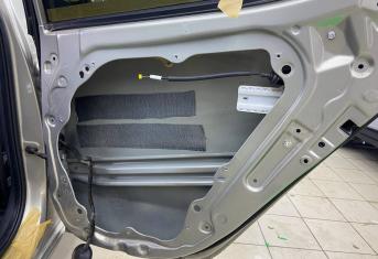 Начинаем работу с разборки дверей, подготовки поверхности и обезжириванию. Все работы по демонтажу пластика выполняются специальным инструментом. Мы гарантируем целостность клипс, креплений и отсутствие различного рода царапин, задиров на обшивках.