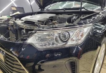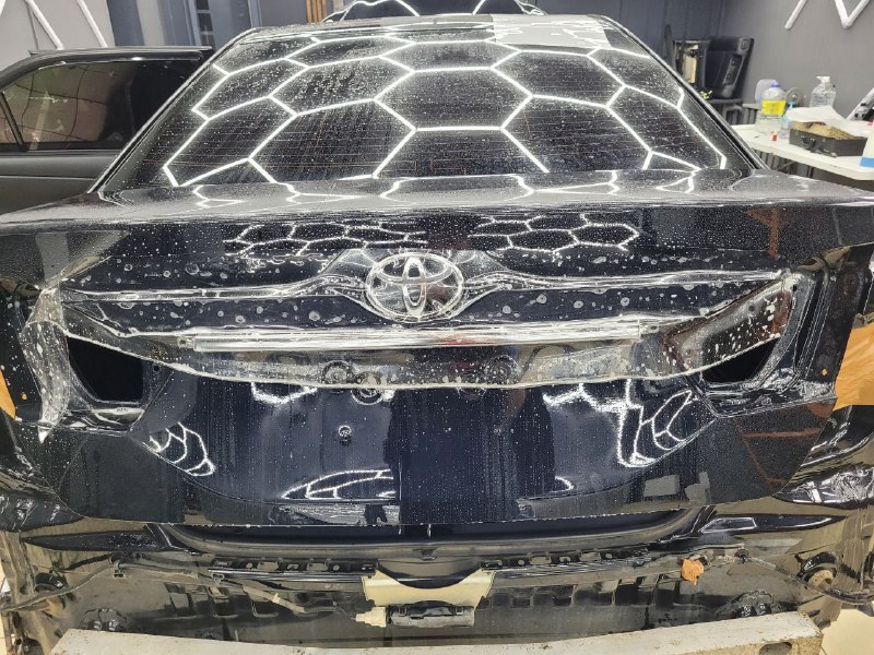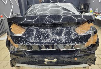 - Арматурные работы – снимаем решетку, бампер из-за его сложной формы. Это необходимо чтобы сделать максимально качественные подвороты пленки.