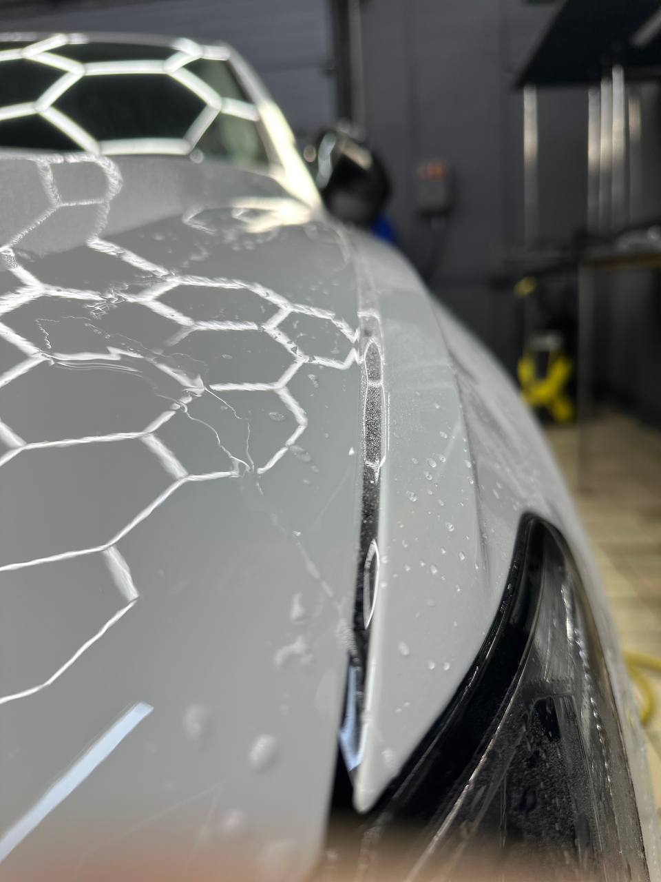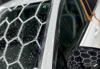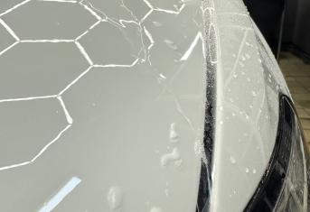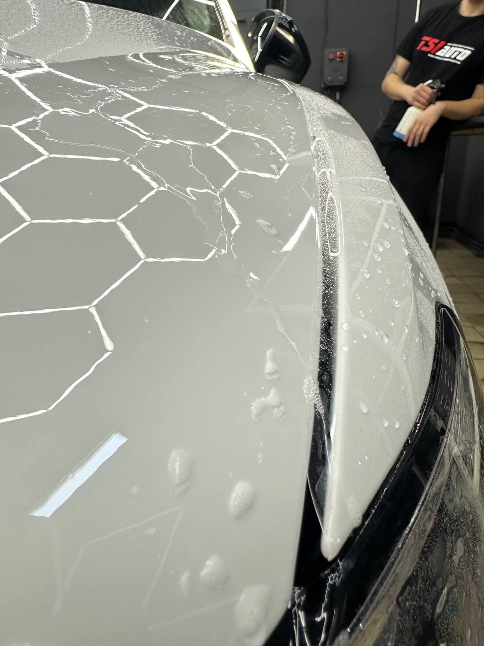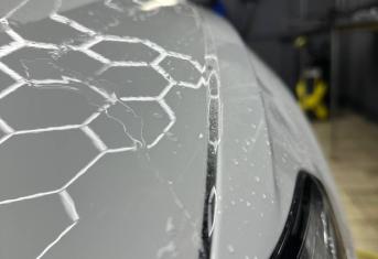 Далее не о процессе, а о конечном результате который получается на данном авто. Автомобиль будет меньше пачкаться, пленка обладает высоким гидрофобным эффектом и грязь не будет задерживаться на кузове. Ну и самое главное это защита, каждый оклеенный элемент выполнен с подворотом пленки по периметру. Сколы и царапины больше не угрожают оклеенным кузовным элементам данного автомобиля, и если вдруг произойдет неприятная ситуация с мелким ДТП к примеру во дворе, с большей долей вероятности этот вопрос решиться заменой пленки на отдельном элементе. Так же автомобиль обрел на долго гарантированный блеск, так как пленка имеет самозаживляющий эффект и мелкие риски и царапинки будут затягиваться под воздействием температуры.
