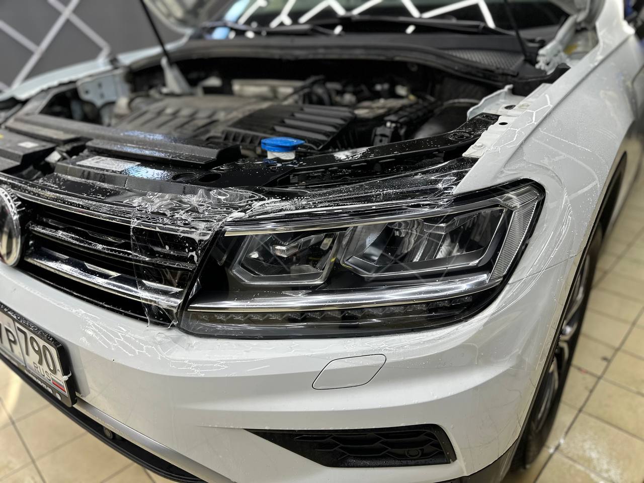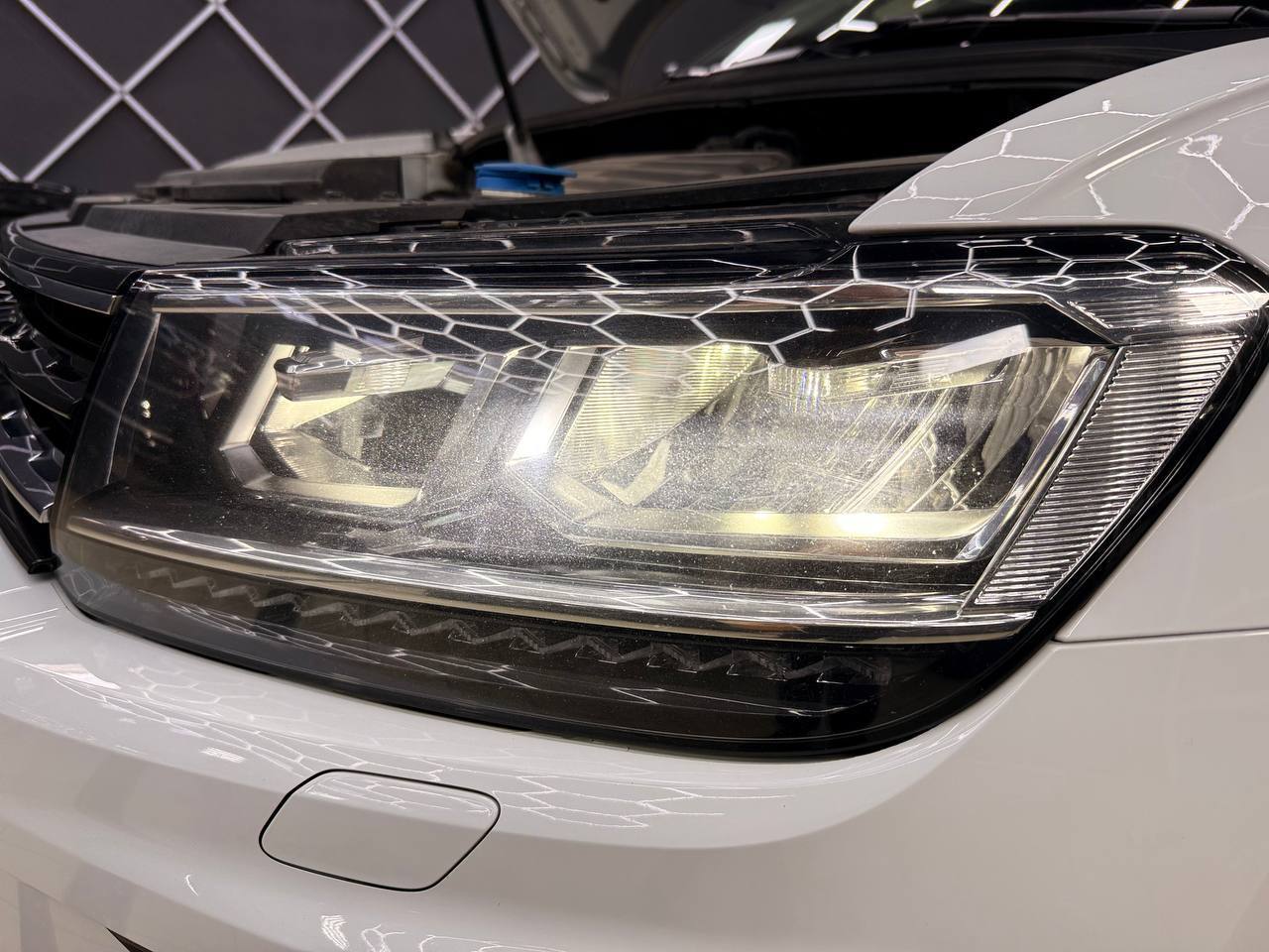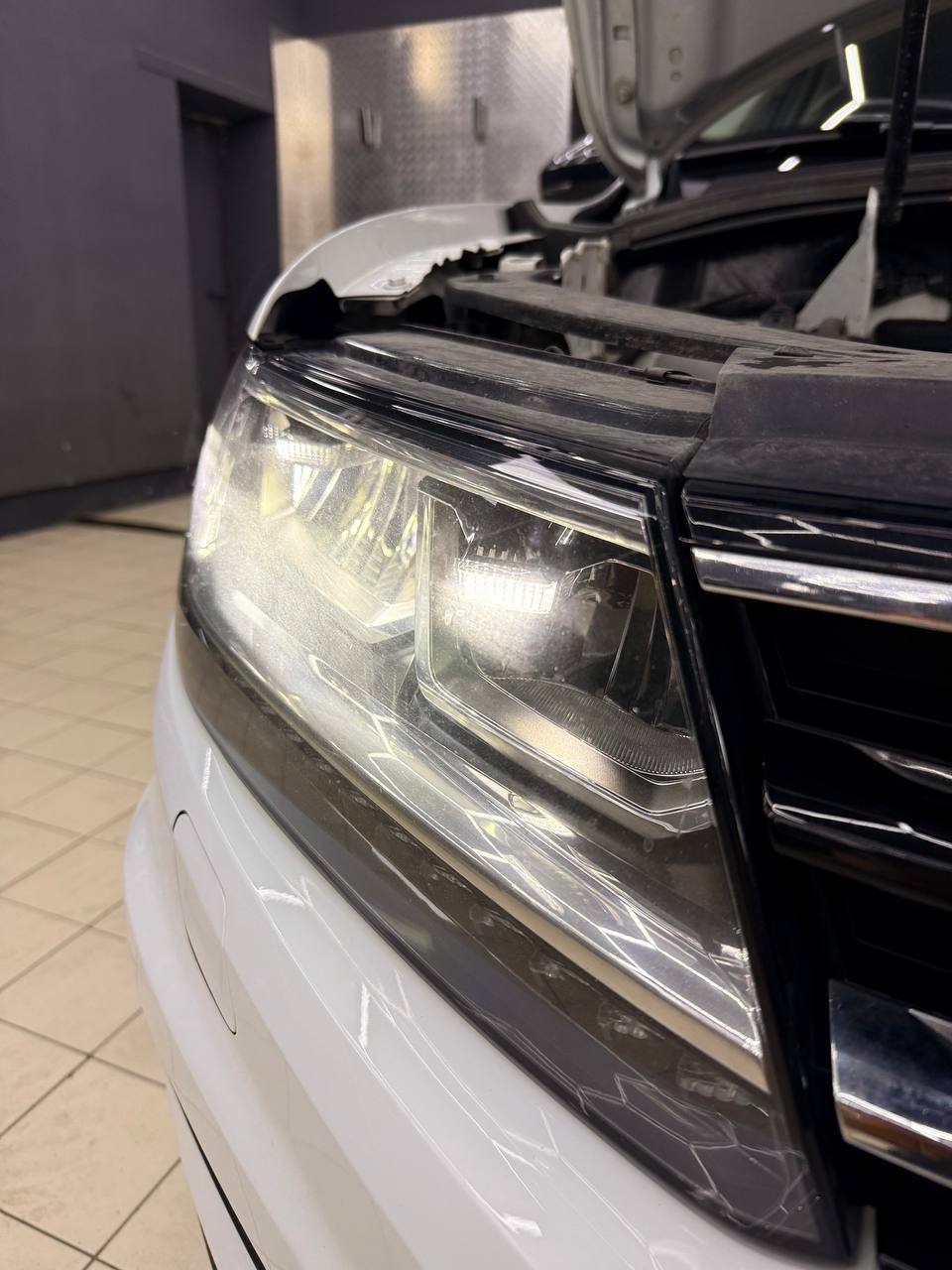 Мы потратили 4 часа на обслуживание Volkswagen Tiguan, что включало полировку и оклейку защитной пленкой. Важно подчеркнуть, что все процедуры были выполнены без демонтажа фар.