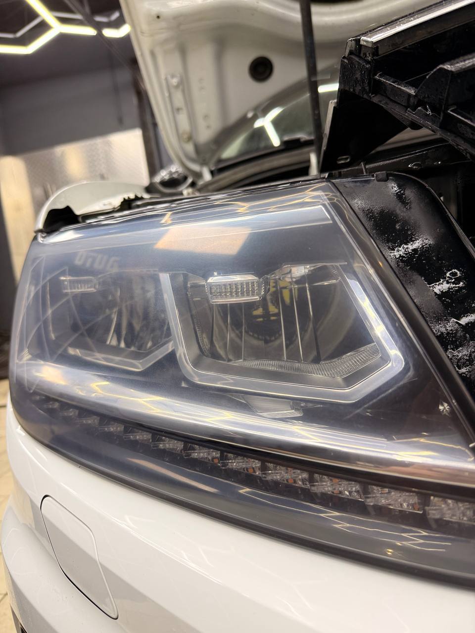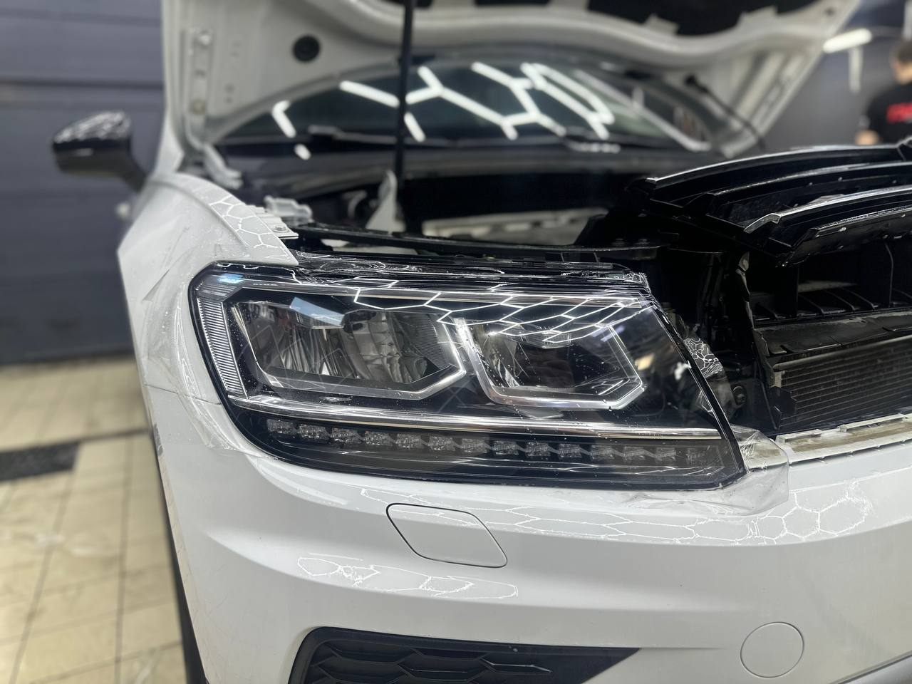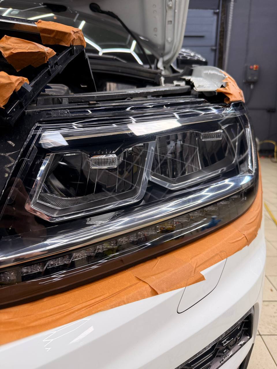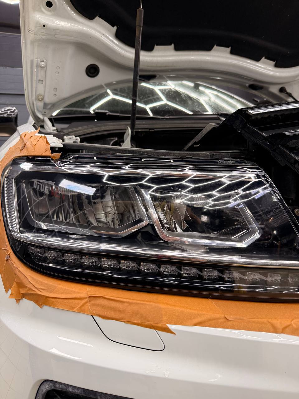 Мы потратили 4 часа на обслуживание Volkswagen Tiguan, что включало полировку и оклейку защитной пленкой. Важно подчеркнуть, что все процедуры были выполнены без демонтажа фар.