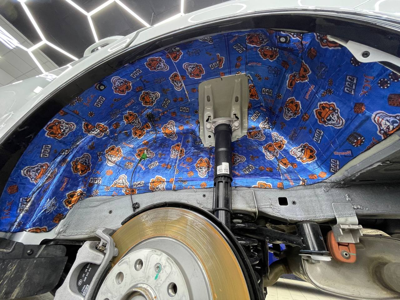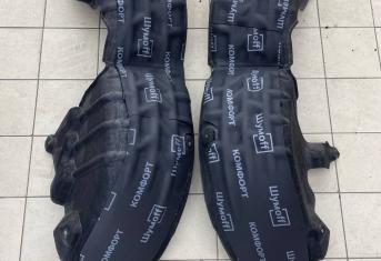 На металл передних арок, сторона к салону, и проем между кузовом и крылом наносим виброизоляцию Шумофф Super Jack. Это технологичный и эффективный вибродемпфер толщиной 3.6 мм с повышенным уровнем адгезии, что позволяет ему прекрасно работать в такой агрессивной среде как арки. Передние подкрылки пластиковые, монтируем первым слоем Шумофф Jack, затем Комфорт 6 и заливаем жидким полимером.