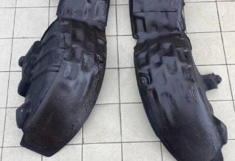 На задние арки монтируем виброизоляцию Шумофф Super Jack по всей поверхности металла. Подкрылки сзади фетровые, на них монтируем только шумоизолятор Шумофф Комфорт 6. Предварительно их необходимо помыть и прогрунтовать клей-спреем. После монтажа материалов на подкрылок и кузов автомобиля, заливаем жидким полимером. Полимерный слой герметизирует швы и защищает шумоизоляционные материалы от механических повреждений, и поверх шумоизолятора создает дополнительный слой звукоотражающей мембраны. После полного высыхания он обретает высокую прочность.
