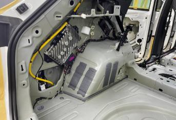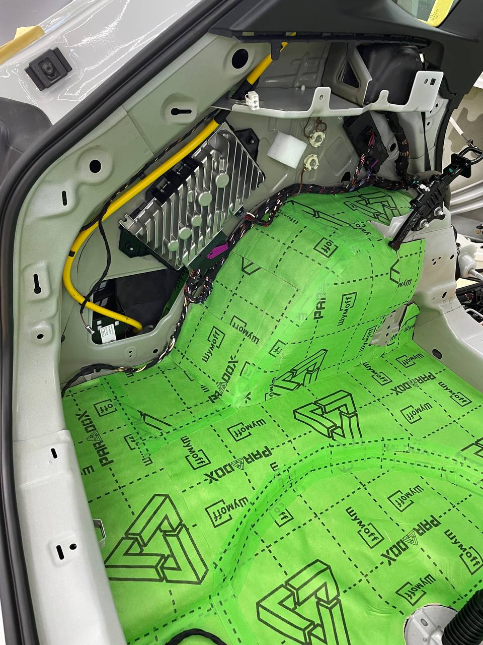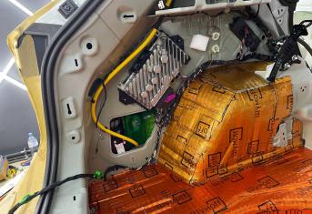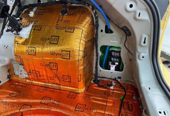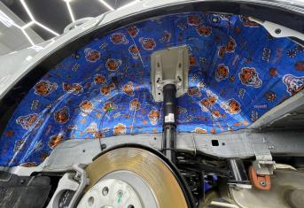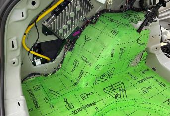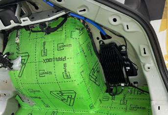 Вторым слоем для шумоизоляции пола мы используем Шумофф Парадокс для всей нижней части салона за исключением места под задним сидением, туда монтируем Шумофф Композит, чтобы избежать проблем со установкой заднего сидения. Это новые материалы от производителя Шумофф, которые включают в себя сразу два слоя и кратно повышают результативность. На задние крылья наносим шумопоглотитель Practick Flex A15.