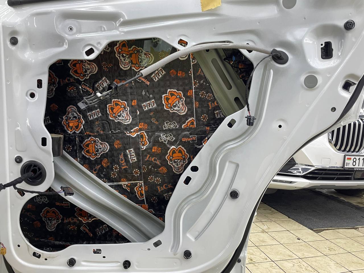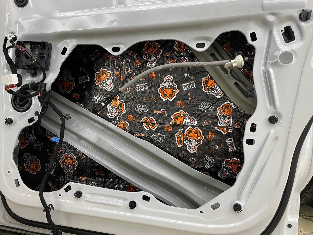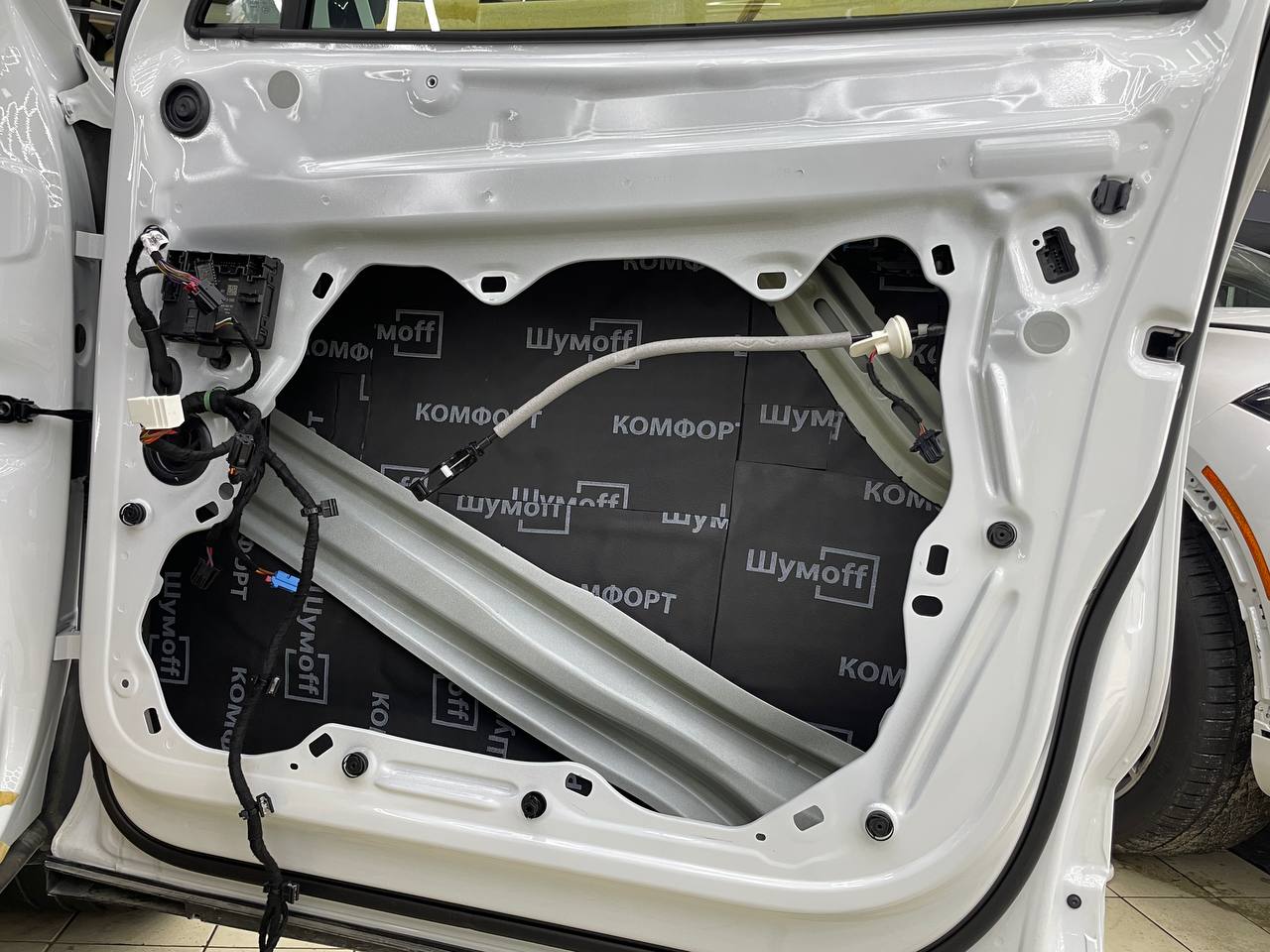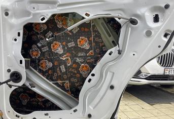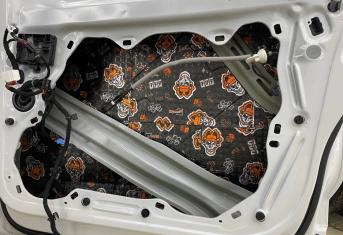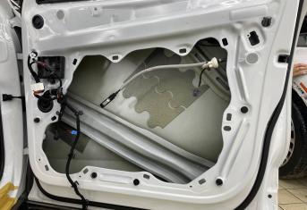 Вторую стенку двери обрабатываем Шумофф Jack. Саму обшивку двери локально оклеиваем виброизоляцией Шумофф Jack для снижения резонанса пластика и полностью закрываем шумопоглощающим материалом Шумофф Absorber А15. По канту обшивки двери укладываем Шумофф Absorber 5, а на открытую проводку Шумофф Specific.