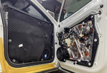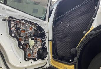Начинаем работу с разборки дверей, подготовки поверхности и обезжириванию. Все работы по демонтажу пластика выполняются специальным инструментом. Мы гарантируем целостность клипс, креплений и отсутствие различного рода царапин, задиров на обшивках.