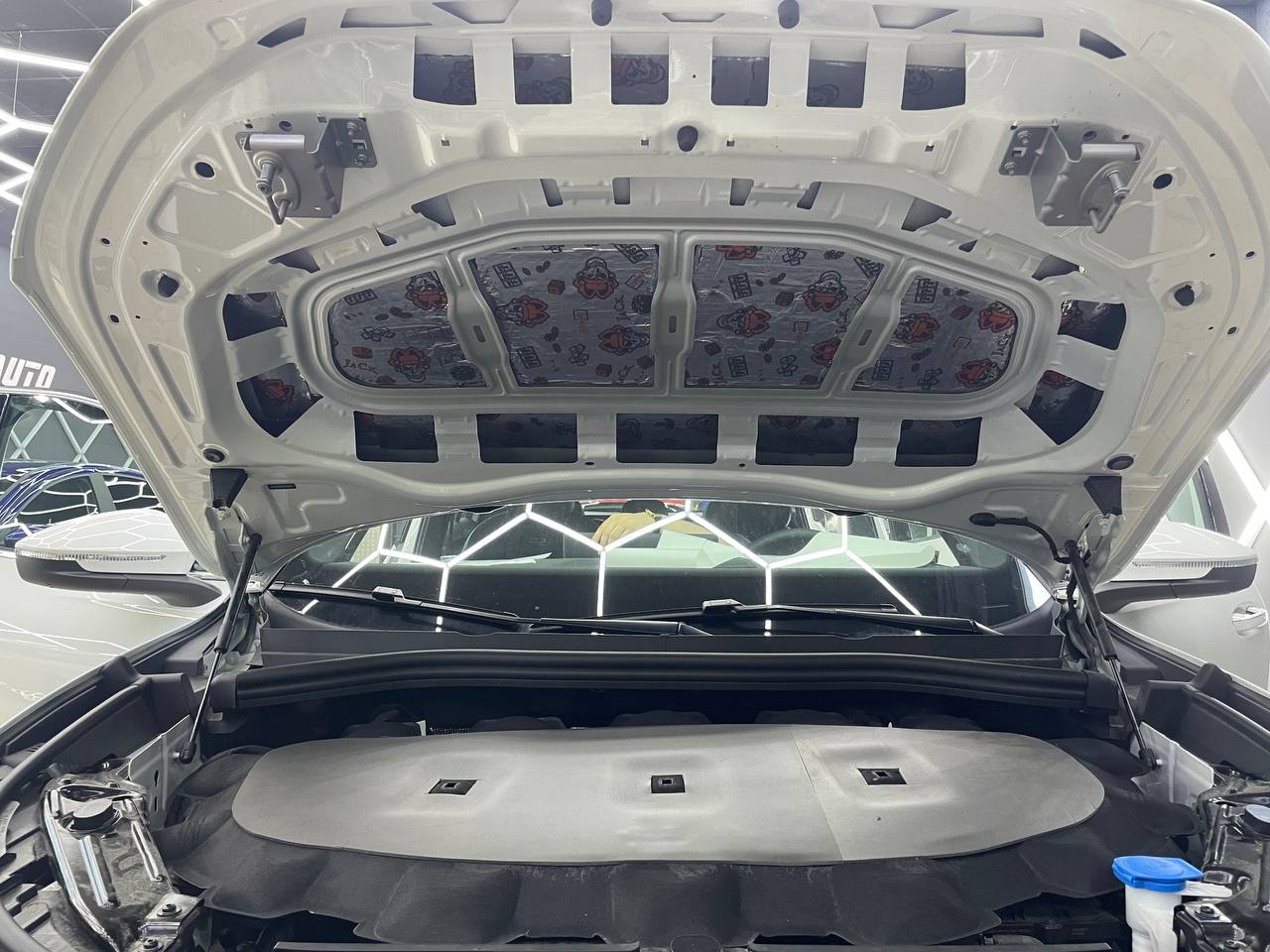 В технологические отверстия капота, на внешний металл, монтируем виброизоляцию Шумофф Jack и на штатную обивку применяем шумо-теплоизоляцию Practik Base 4.