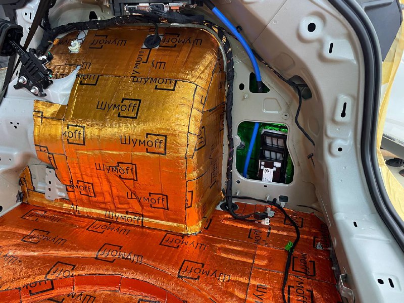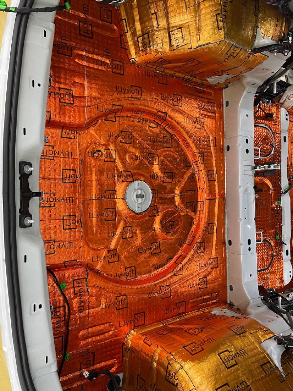 Первым слоем укладывается виброизоляция Шумофф М4, М3 и М2, разница в толщине, весе и зоне применения материала. Шумофф М4 пойдет на переднюю часть пола и задние арки. Остальную поверхность обрабатываем Шумофф М3. М2 отлично подходит для задних крыльев. Поверх усилителей она не наносится, чтобы избежать парникового эффекта и появлению влаги под ковром.
